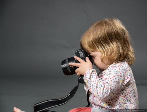 В гостиную торжественно входит маленькая девочка - года 2 - и тянет за ремень сумку от большого фотоаппарата. Останавливается. Делает взмах, сумка описывает дугу и с грохотом ударяется об пол. Бац!